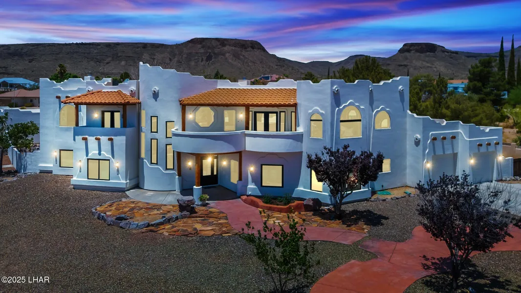 Stunning Southwestern/Mediterranean influenced Mansion in the Belle Vista Estates situated on over an acre with 360 degrees mountain views. Inside boast a massive Great Room with 22' ceilings and tile plank floors throughout the living space. Nearly 5500 sq ft offering 6b/5b and nearly 2000 sq ft between 3 separate garages accommodating 8 vehicles. Fully renovated in 2022 w/3 new A/C units, new windows and natural gas comfort is ensured. The chef's kitchen features Quartz counters, Thor gas double oven, pot filler, wine fridge, and a massive island. The spacious primary suite boasts a fireplace, soaking tub, walk-in tile shower, and dual closets. 1 guest bedroom/office located off the entry and 4 upstairs all with Jack & Jill bathrooms. Balconies front and back to enjoy the annual fireworks right from home. Don't miss the bonus room off the rear balcony. Outside features spacious patio's for entertaining with room to add a pool and RV garage. The detached workshop with AC was originally designed to be a casita which is plumb and ready to be converted to living space. 50 amp RV hookups & 800 amp total service. Imagine making this your Homestead or a luxury short-term rental retreat.