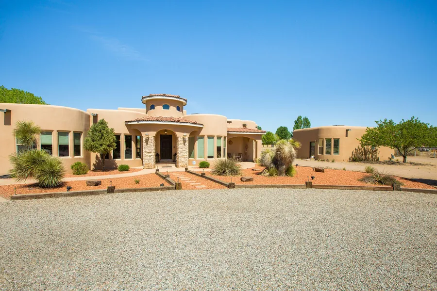 Exquisite Spanish Mediterranean home includes a Casita. Nestled on 1.25ac, located in the desirable Valle Verde Estates. The main house offers 4 bedrooms, 3 full bath, a home office with its own entrance, 3 car oversized garage, and a RV Carport. Enjoy the panoramic views from this open floor plan, which offers vigas, soaring ceilings with tongue and grove, barrel hallways, and nichos throughout. Beautiful travertine and Bamboo flooring heated by radiant in floor heating. Enjoy the evenings outside around the fireplace or pretend you're camping and huddle around the in ground fire pit. The inviting Casita offers an open kitchen and living, an oversized bedroom, bathroom and back patio to enjoy your morning coffee.