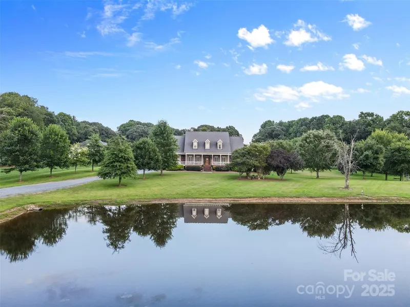 Welcome to this Retreat on Arlington Church, a rare gem on 5 acres in Mint Hill, NC! This 3,500 sqft two-story home features a 2,000 sqft unfinished basement full of potential. The property includes a serene stocked pond and two detached garages, one an impressive 36x50 structure with 10-foot doors and the other with an unheated apartment. Relax on the rocking chair front porch and take in the sunsets over the pond. Inside, a grand two-story foyer leads to a cozy office, formal dining room, and a spacious living area. The charming kitchen with unique brick flooring connects to a casual dining nook, and both open to a large deck overlooking the beautifully landscaped property. The main floor boasts a large primary bedroom with an ensuite, along with a convenient laundry room. Upstairs are three additional bedrooms. The expansive grounds offer mature landscaping, total privacy, and endless...