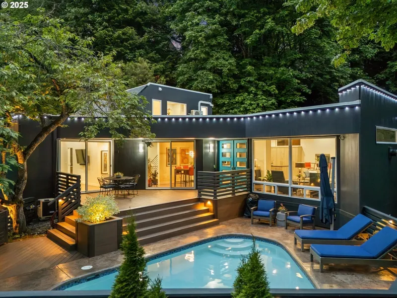 Exquisitely reimagined from top to bottom, this architectural gem in the coveted West Hills is a one-of-a-kind treasure. No detail was spared-from top-tier appliances, whole home natural gas generator, smart-home features, and high-end finishes throughout. The open-concept main level is filled with natural light and treetop views. Step outside to enjoy the cascading waterfall, lush landscaping, and sparkling heated pool-your own private resort year-round. The newly renovated kitchen features Thermador appliances, a wine cabinet, stone countertops, a large island, and abundant storage. It flows seamlessly into the great room with cedar ceilings and a sleek modern fireplace. The main-level primary suite offers a spa-like escape with dual vanities, heated floors, oversized shower, a towel warmer, and a custom closet. Upper and lower levels offer versatile bedrooms and full baths, ideal for guests or even ADU use. Don't miss the rare 3-car garage with EV charging station. Lux TimberTech decking and smart drip irrigation system throughout the property. All just minutes from NW 23rd, the Zoo, Japanese Garden, and Washington Park!