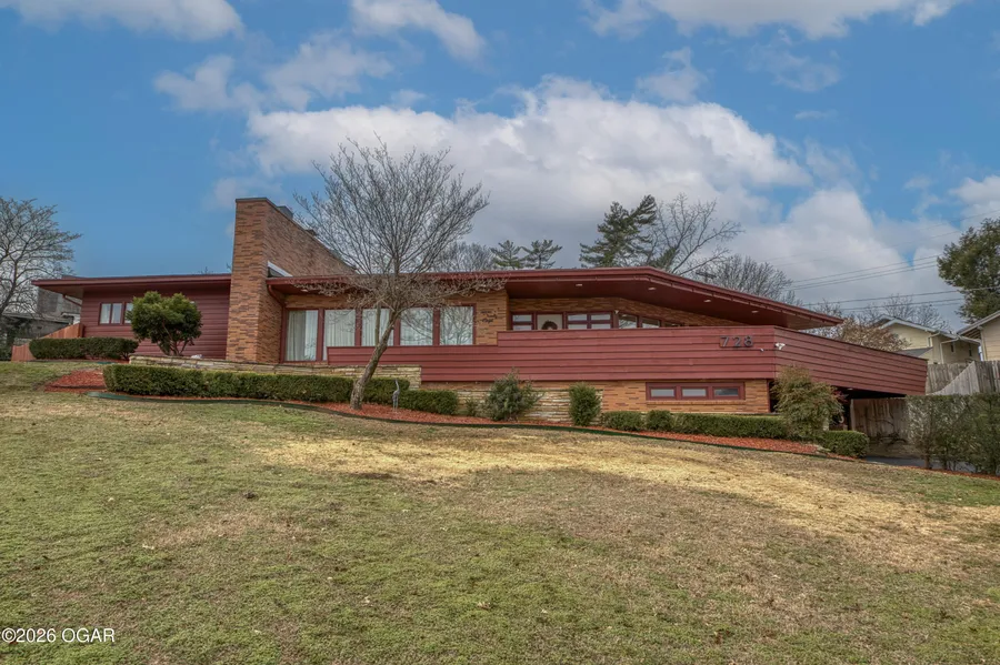Rare opportunity with this unique 1952 Mid-Century Modern Frank Lloyd Wright inspired home. Recently renovated with a custom-made kitchen featuring granite countertops, lots of storage, and an eat-in banquette. The fabulous kitchen overlooks a beautiful new heated salt water pool and professionally installed landscaping. The exterior has been freshly painted, the huge lot is the envy of this prestigious Roanoake neighborhood, and this 4312 SF home is move-in ready. Unique interior and exterior architecture with a fantastic floor plan featuring 4 bedrooms and 5 bathrooms, along with floor-to-ceiling imported Honduran-encased windows on the east and west sides that bring in more natural light than you can imagine. Craftsman-installed hardwood floors throughout and intricate tile work await you in every room. This historic home has both gas and wood fireplaces and two separate living areas featuring a partially finished basement with a fully stocked wet bar and recreation room downstairs. 2 car attached garage, plus covered parking, and a 5400+ SF newly resurfaced driveway. This extremely rare property also features an 800 SF wrap-around upper deck that overlooks the entire neighborhood, offering yet another place to entertain guests and enjoy the outdoors. This immaculately preserved Mid-Century gem is one of Joplin's most unique properties and one that will not last. Schedule your showing today before it's gone!