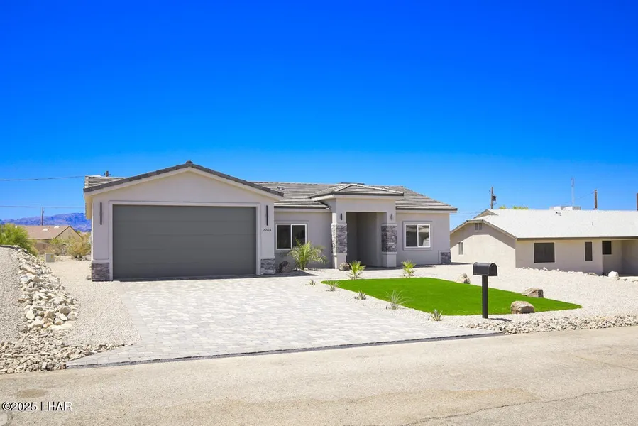 Stunning New Construction by Devett Development! This beautifully crafted 4 bedroom, 2 bath home offers exceptional quality and modern design throughout. The thoughtfully designed split floor plan provides both privacy and functionality. The kitchen is a true highlight, featuring leathered granite countertops, a spacious kitchen island, and a walk-in pantry, perfect for entertaining and everyday living. Enjoy low-maintenance, lush turf landscaping in the front yard, complemented by elegant pavers on the driveway, walkways, and covered back patio. The boat deep garage includes 9 foot doors and a mini split, ideal for oversized vehicles or all those Lake Havasu toys. A rare blend of style, comfort, and practicality, this home is a must see!