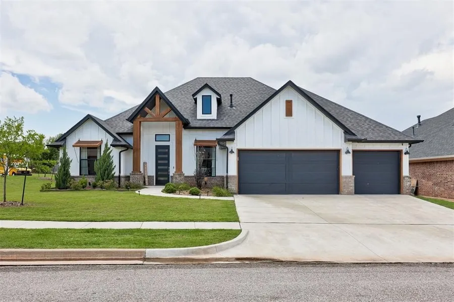 If you're looking for modern luxury only 15 minutes from OU's Campus Corner, here's the one for you! Custom-built by Landmark Fine Homes in 2022, this modern residence blends thoughtful design, functional luxury, and high-end finishes. With 3 beds, 2 baths, a dedicated office AND a full media room, this home offers flexible space for both productivity and relaxation. As you grace the front entry you'll be welcomed by an open-concept layout with soaring ceilings that make every inch feel light and expansive. The living, kitchen, and dining areas flow seamlessly-perfect for entertaining or cozy nights in. The kitchen is a true showpiece, featuring a large center island with waterfall marble countertops, crisp white cabinetry, and a deep navy blue accent that anchors the space with timeless style. A cozy eat-in breakfast nook adds charm and functionality. Enjoy wood-look tile flooring in all common areas for a sleek, low-maintenance finish. Laundry room with a barn door and custom shoe rack, plus tons of storage throughout. The split floorplan offers privacy and balance, with the primary suite and office tucked away on one side, and the secondary bedrooms on the other-ideal for guests, little ones, or a home gym. The 3-car garage includes an 8-person in-ground storm shelter for peace of mind. Sitting on a large corner lot, the fully fenced backyard is lined with a stained stockade fence and equipped with French drains-ready for Oklahoma weather. This is more than just a house-it's a lifestyle upgrade in one of Norman's premier neighborhoods.