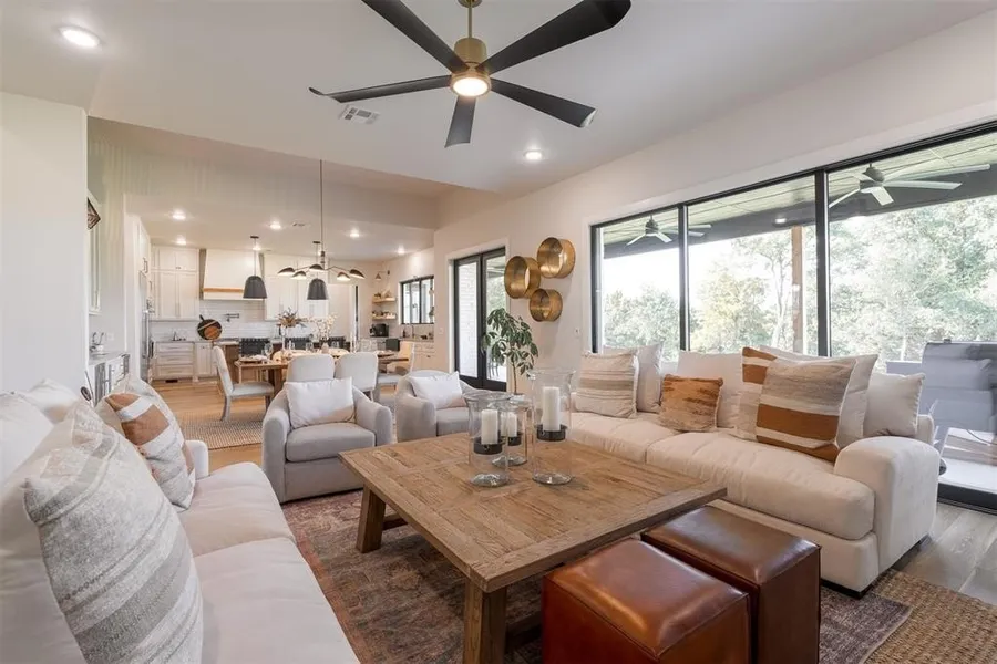 A Southern California vibe perfect for those who want all the things but a smaller footprint. Elegant, efficient and your ticket to easy living. Every inch has been thoughtfully designed for both style and function, using the highest quality materials throughout. Set on a beautiful corner lot surrounded by mature trees, bringing back the charm of the large front porch - the kind made for gathering on warm summer evenings. Inside, you'll find the perfect balance of refined luxury and comfortable living. The large open kitchen with oversized island, dining and living is ideal for entertaining and everyday life (see floor plan in photos). Three distinct living spaces - a family room, study and media room (optional 4th bedroom). Expansive picture windows overlooking the spacious covered patio and tree-lined view. Highlights include a Monte Cristo iron entry door, expansive picture windows (Pella) + tri-fold patio doors (Pella), a blend of Quartzite, Soapstone and Marble countertops throughout + fantastic storage. The kitchen is a chef's dream with Thermador Stainless Steel Appliances - double ovens, a six-burner gas stove, microwave. Also included, pot filler, oversized island with vegetable sink with disposal . The dedicated bar area includes a sink + a wine refrigerator + a beverage refrigerator + water filtration system. The primary suite has a spa-like custom shower, illuminated/touch mirrors, marble countertops, an elegant stone tub, large walk-in closet perfectly designed for organization & efficiency. The study is light and bright with gorgeous built-ins. 3rd living/media room with 12' ceilings and wood floors. Each bedroom has an en suite bathroom. Additional features include custom window treatments, designer lighting and hardware, custom storage solutions, incredible pantry, beautiful laundry room, mudroom, a central vacuum system, smart home features, Dual-zone HVAC systems with zoning controls, custom drip irrigation system, Generac Generator and more.