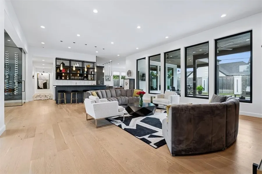 First time ever on the market! Within walking distance to the Oklahoma City Golf & Country Club, this stunning modern home showcases timeless architecture, luxurious finishes, and a floor plan designed for both comfort and entertaining. Expansive living spaces feature wide-plank hardwood floors, designer lighting, and walls of windows that fill the home with natural light. The main living area centers around a striking fireplace and flows seamlessly into the chef's kitchen with a massive island, professional-grade appliances, and floor-to-ceiling cabinetry. A second living area with a full bar and glass-enclosed wine room offers an incredible space for hosting or relaxing. Each bedroom includes its own ensuite bath, while the private primary suite is a retreat with spa-like finishes and large windows overlooking the backyard and pool. The home also includes two spacious laundry rooms-one in each wing-providing ultimate convenience for guests and family alike. Step outside to the covered patio and enjoy a resort-style backyard with heated pool, artificial turf lawn, and multiple lounging areas. Additional highlights include two oversized two-car garages (four total bays), a dedicated fitness room, designer powder bath, and extensive storage throughout. Blending style, function, and a premier Nichols Hills location, 2525 Somerset Place offers an unmatched combination of modern design and everyday livability-just steps from OKC's finest golf, dining, and shopping.
