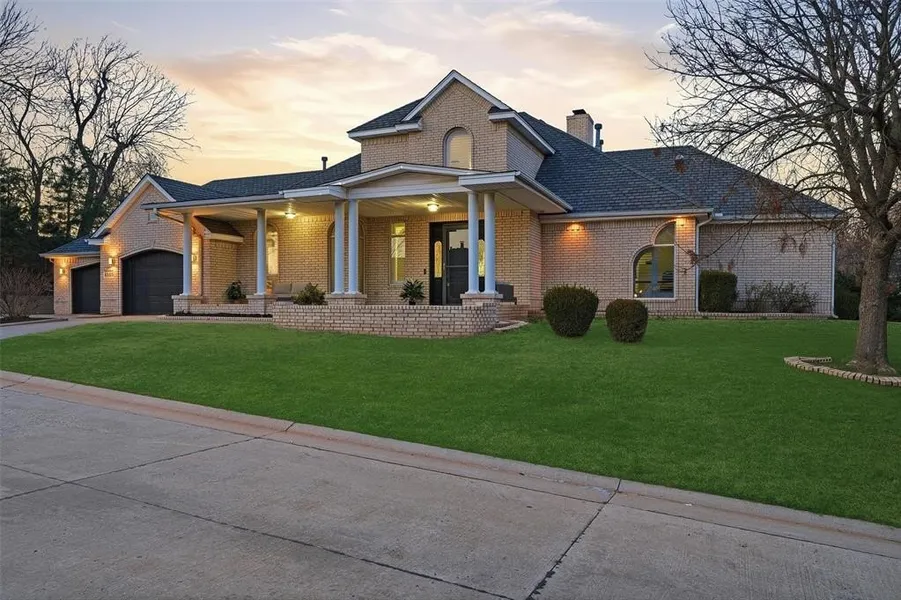 Set on a beautifully treed lot just under half an acre, this modern home offers a rare sense of privacy with peaceful views of a creek and pond beyond the backyard. An oversized covered front porch welcomes you in, while plantation shutters and clean architectural lines hint at the thoughtful design found throughout the home. Inside, a dramatic two story entry makes an immediate impression, anchored by a graceful curved staircase that sets the tone for the spaces beyond. Natural light pours into the home, most notably in the stunning two story dining room where floor to ceiling windows frame the heavily wooded backyard and tranquil water views. The kitchen is both spacious and functional, featuring granite countertops, double ovens, and ample room for entertaining while staying connected to the main living areas. Recent updates elevate the home's comfort and versatility, including new flooring, refreshed paint in select rooms, and a beautifully updated bathroom. The addition of a sunroom off the back of the home creates a flexible living space that works seamlessly as a second living area, home office, or quiet retreat overlooking the backyard. Practical upgrades extend to the garage as well, which has been fully repainted and finished with epoxy flooring, along with EV outlets for added convenience. The primary suite offers a true sense of retreat, highlighted by an oversized shower with dual shower heads, a custom walk in closet with built in storage, and the added peace of mind of a dedicated safe room located just off the closet. Every update has been thoughtfully completed to enhance both style and function, making this home as comfortable as it is visually striking. Offering modern design, meaningful updates, and a serene natural setting, this property is a rare find in Oklahoma City. Do not miss the opportunity to make this private retreat your own. Schedule your private showing today!