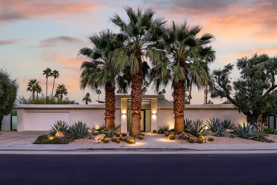 Modern desert oasis on fee land in the coveted Indian Canyons neighborhood. Featured in Architectural Digest in 1980, this 3,120 sq ft custom residence was designed to celebrate light, space, and seamless indoor-outdoor living. Clean architectural lines, sun-filled interiors, and a calm, confident modern presence are complemented by crisp white finishes, generous volumes, and contemporary finishes that create a refined yet relaxed desert aesthetic throughout. A dramatic formal entry sets the tone. A glass-screened entry courtyard opens to a covered walkway punctuated by circular roof cutouts that flood the space with natural light, leading to a pivoting clear-glass front door. Inside, the floor plan unfolds with intention-living, dining, and entertaining spaces arranged to feel open yet well defined, with clear sightlines to the outdoors and an abundance of sliding glass doors connecting to patios and pool areas. The living and dining spaces are expansive and gallery-like, ideal for entertaining, while maintaining a sense of ease and livability. Original Hollywood Regency details, including select cabinetry and bathroom fixtures, add character and warmth, thoughtfully balanced with modern updates such as a smooth stucco exterior, and large-format tiles that keep the home feeling current. Outdoor living is a true highlight. A charming side-yard dining courtyard evokes the intimacy of an Italian village, offering a distinctive and inviting setting for alfresco gatherings. Beyond, a large midcentury-style pool anchors a well-curated leisure area positioned to capture coveted southern views of the San Jacinto Mountains, creating a serene backdrop for both relaxation and entertaining. The home offers three spacious bedroom suites and three-and-one-half baths. The primary suite is generously scaled, with space for a sitting area or home office, and opens directly to the pool and outdoor shower. The primary bath includes two large walk-in closets. Both primary and secondary baths include radiant heated floors. Other features include a travertine clad fireplace, Sub-Zero refrigerators throughout including two full sized wine fridges, 58 solar panels, full California closet build outs in all bedroom closets, and meticulous desert landscaping. A rare opportunity to own a fee land home in Indian Canyons, one of the most sought-after neighborhoods in Palm Springs, showcasing timeless midcentury architecture and seamless indoor-outdoor living.