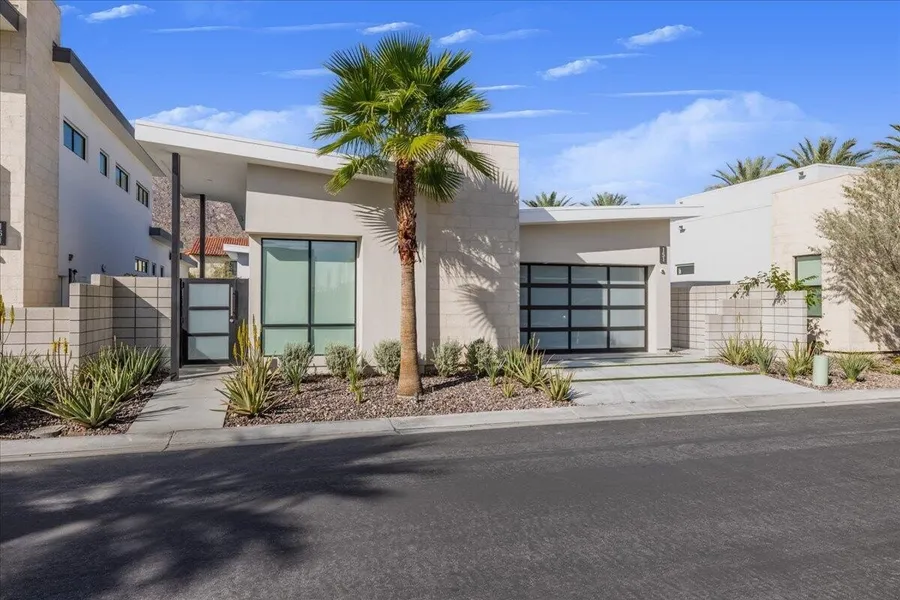 Iconic mid-century design meets modern luxury in The Vue, a gated enclave in the heart of central Palm Springs. Completed in 2023, this single-story architectural residence offers refined design, seamless indoor-outdoor living, and timeless desert appeal. The home's striking butterfly roof sets the tone, while an open-concept layout is flooded with natural light from expansive clerestory windows. Thoughtfully designed for both entertaining and everyday comfort, the residence features 2 spacious bedrooms, 2.5 bathrooms, and a versatile office/den. The chef's kitchen commands attention with premium Thermador appliances, quartz countertops, and a dramatic waterfall island, flowing effortlessly into the living area for a clean, contemporary aesthetic. Dual multi-slide glass doors open to a private backyard retreat with a covered patio ideal for dining and relaxation. A south-facing cocktail pool with Pebble Tec finish and three cascading waterfalls delivers a true resort-style experience, complemented by stunning views of the San Jacinto Mountains. Notable upgrades include built-in speakers with Sonos system, custom electric blinds throughout, a hardwired alarm system, and owned solar panels, blending luxury with energy efficiency. Just minutes from Palm Springs' top restaurants, shopping, and iconic hotels, this is a rare opportunity to own a nearly new architectural home in one of the city's most desirable locations.