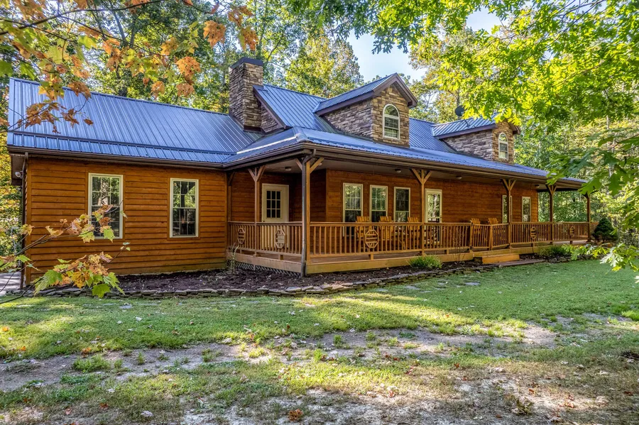 Welcome to this one and a half story home set on a flat lot with mature trees and plenty of outdoor space. The exterior combines wood and vinyl siding with cultured stone accents on the gables and a durable metal roof. A covered front porch runs across the main portion of the house and continues around the side, while a back deck off the dining area creates another spot to enjoy the outdoors. Inside, the entry opens to a spacious great room with tall ceilings, tongue and groove poplar detail, and a combination of hardwood, tile, and carpet flooring. This open area connects the living, dining, and kitchen spaces. Stairs to the right lead to an upper level bedroom with its own full bathroom. The main level includes a full bathroom, two additional bedrooms, a large utility room, and stairs to the basement. The basement is full and unfinished, offering the option to finish for added living space or use as a workshop. An attached garage includes one bay with an added mudroom that connects directly into the great room. With room to expand through future additions such as storage buildings, a detached garage, or even a pool, this property offers space to grow. It is located only 15 to 20 minutes from Cave Run Lake and about 10 minutes from downtown Morehead and Morehead State University.