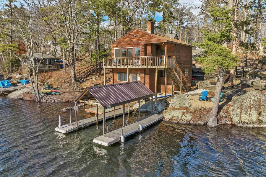 Come experience the charm and tranquility of this beautiful interior renovated lake home, nestled in the serene Hanson Cove on Lake Winnipesaukee. This 2 bed, 2 bath year-round residence offers a perfect blend of modern comfort and lakeside living. 182 feet of private shorefront rounds the shoreline allowing for the property to feel bigger than it is with a nice sense of privacy. Enjoy boat slips with a metal canopy roof and a swim platform moored just off shore. Western facing views means you get to enjoy afternoon warmth and partake in sunsets with your friends & family. Hanson Cove is known for calm waters in a wake-free cove making it perfect for not only taking the boat out to the larger part of Lake Winnipesaukee, but for kayaking, swimming, & canoeing. This property is owned by the Timber Vikings who specialize in building timber frame homes. Enjoy the home the way it is, OR they could offer a build-to-suit package, allowing you to create your dream estate on this stunning property that is situated so close to the water. Whether you're looking for a serene retreat or a place to entertain family and friends, this home has it all.