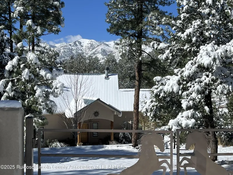 SECLUDED MOUNTAIN RETREAT WITH STUNNING VIEWS! Nestled in a private setting with a gated gravel driveway, this maintained 3BD/2BA home offers panoramic views of Sierra Blanca & serene wooded valleys. The home features a metal roof, stucco exterior, & well-designed landscaping for year-round enjoyment. There is an inviting open floor plan with high-vaulted ceilings in the kitchen, dining, & living areas. The space is enhanced with wood & carpet flooring, granite countertops, a breakfast bar, & stainless style appliances. Also offers a multi-purpose bonus game-sleeping room. Enjoy year-round comfort with central forced air heat & air conditioning. A front covered patio adorned with a tongue-and-groove ceiling & a spacious back covered deck. Furnished!