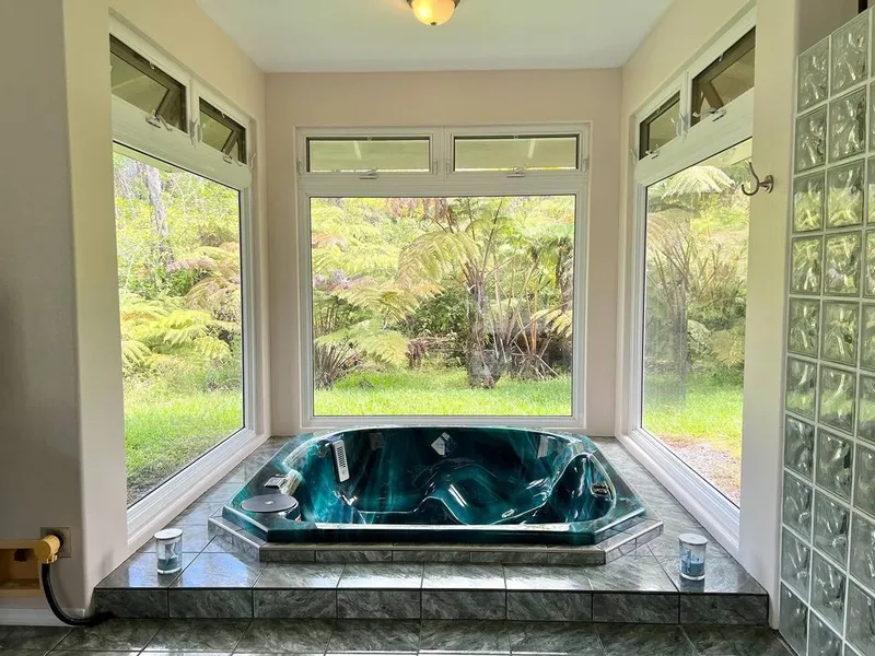 Tucked deep within a native ohia forest, this fully permitted off-grid "glass house" offers 20 private acres of peace, sustainability, and comfort. If you're looking for acreage, privacy, and a quiet sanctuary away from the noise of the world, this is the one. Custom built with intention and high-quality materials, this one-of-a-kind 2-bedroom, 2.5-bath home features floor-to-ceiling windows, letting in natural light and lush green views from every room. Both bedrooms are spacious primary suites. One with a 6-foot jetted tub and shower, the other with a sunken oversized jacuzzi; creating a retreat-like feel. Framing and siding are Canadian Red Cedar, reinforced concrete foundation was poured over 26" 3200-lb. pre-stress steel, and a 14-gauge steel roof was installed with plywood sheeting, felt paper, and battens. Hurricane-resistant windows cost $5,500 each, and the doors are oriel-vault...