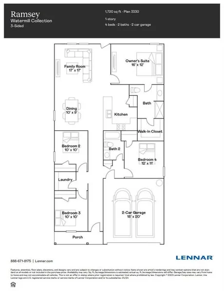 Lennar Ramsey Plan - This home is still under construction, with an expected closing date of 04/22/26. Welcome Home to this single-story, 1720 sq ft of spacious living, featuring 4 bedrooms and 2 baths. Upon entering, you'll find your 3 secondary bedrooms and a full-sized bathroom. The owner's suite is perfectly situated at the rear of the home to enjoy some privacy, complete with an en-suite bathroom and walk-in closet. Ideal for your family gatherings is the open-concept kitchen, dining and living room with easy access to your rear yard for entertainment. Home includes a 2-car garage. Stainless Steel dishwasher, range and microwave included. Prices, dimensions and features may vary and are subject to change. Photos are for illustrative purposes only.