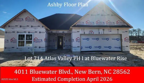 ''Ashby'' floor plan is under construction in the brand new Atlas Valley Phase of Bluewater Rise. Builder offering $10,000 buyer incentive w/ use of preferred lender & closing attorney! 3 Bedroom, 2 bath plan with covered back porch. Open main living areas with center island kitchen & nook. Granite countertops and laminate floors in foyer, dining room, kitchen & nook. 2 miles from Creekside Elementary School. Convenient to downtown New Bern & Cherry Point MCAS.