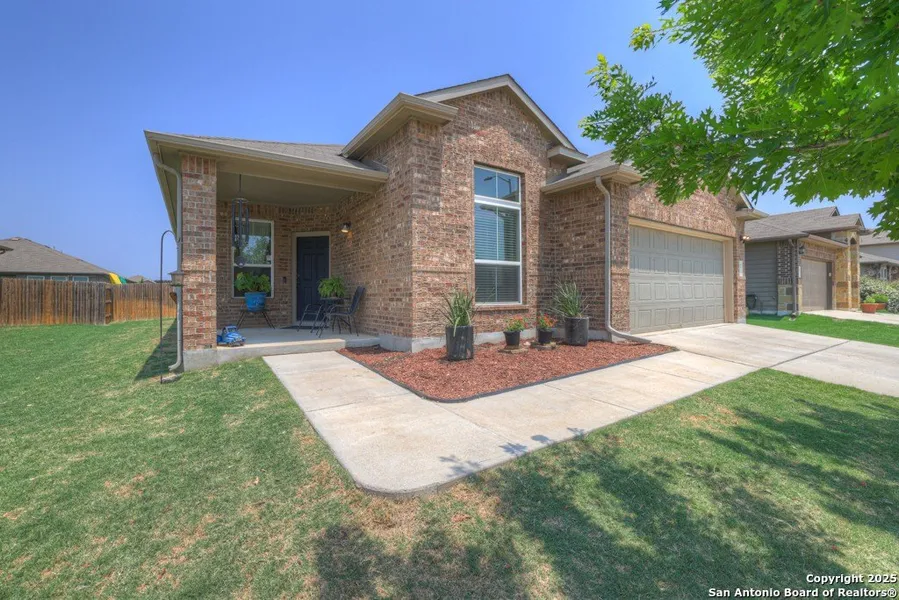 This roomy 4 bedroom 2 bath home was built in 2018 and is located in the peaceful neighborhood of Saengerhalle. Comfort is the name of the game for this split floor plan with two living areas. The large primary bedroom is towards the back of the house for privacy. Two additional bedrooms are down a hallway off the 2nd living area and convenient to the second bathroom and laundry room. Located in the front of the home, a 12 ft ceiling makes the fourth bedroom stand out and perfect to be used as a study/office or guest room. With granite countertops and a large island perfect for casual dining, the spacious kitchen is open to the dining area and large living area. An additional 10 x 20 concrete patio has been added to the covered back porch to provide additional outdoor living space. The front yard has two healthy and beautiful trees and there is an irrigation system in both front and back...