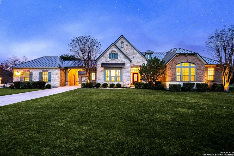 This beautifully designed two-story Texas Hill Country-style home sits on a generous 1.10-acre partially wooded cul-de-sac lot, offering privacy, space, and scenic surroundings. The home features 4 bedrooms and 3.5 bathrooms and includes thoughtful upgrades such as a tankless water heater, water softener, and a durable metal roof installed in August 2022. The interior has been freshly painted, creating a bright and move-in-ready atmosphere throughout. The well-planned main level includes the living room, family room, study/office, kitchen, dining room, utility room, and the primary suite, along with additional bedrooms that allow for convenient main-level living. A striking stone-accented fireplace adds warmth and character to the living room. Outdoor features include a covered porch and a dedicated hot tub pad that is prewired and ready for use, along with mature trees, a sprinkler system, and wrought iron fencing along the front of the property. The home offers exceptional parking and storage with a two-car garage located off the breezeway and an additional three-car garage off the back porch, both connected by covered walkways. Conveniently located near schools, the home also provides access to community amenities such as a clubhouse, controlled access, pool, tennis courts, jogging trails, basketball court, and park/playground-creating a perfect balance of luxury, functionality, and Hill Country charm.