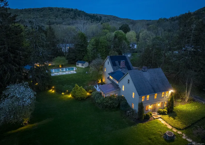 This historic 18th-century Gaylord family homestead in New Milford, Connecticut, offers a perfect blend of authentic period charm and thoughtful modern enhancements. Set on picturesque grounds at 43 Gaylord Road, this distinctive Litchfield County property features versatile living spaces including an open-concept kitchen, living room, inviting Sun Room, formal dining room, and a cozy Snuggery with brick fireplace abutting the kitchen. The upper level showcases a spacious primary bedroom with vaulted ceilings, two walk-in closets, an en-suite bathroom, and a private balcony overlooking the backyard oasis. Three additional bedrooms and a full hall bath complete the second floor, providing generous accommodation for family and guests. Outdoor living reaches its pinnacle with a heated in-ground swimming pool, adjacent cabana, and expansive entertainment areas perfect for gatherings of all sizes. The property's amenities extend to a two-car attached garage and separate temperature-controlled barn offering versatile space for storage, workshop, or creative pursuits. Perfectly positioned with nearby hiking trails, minutes to Kent and New Milford's charming village centers, and convenient access to Metro North, this exceptional historic estate combines architectural significance, modern comfort, and an ideal location in one of Connecticut's most desirable communities.