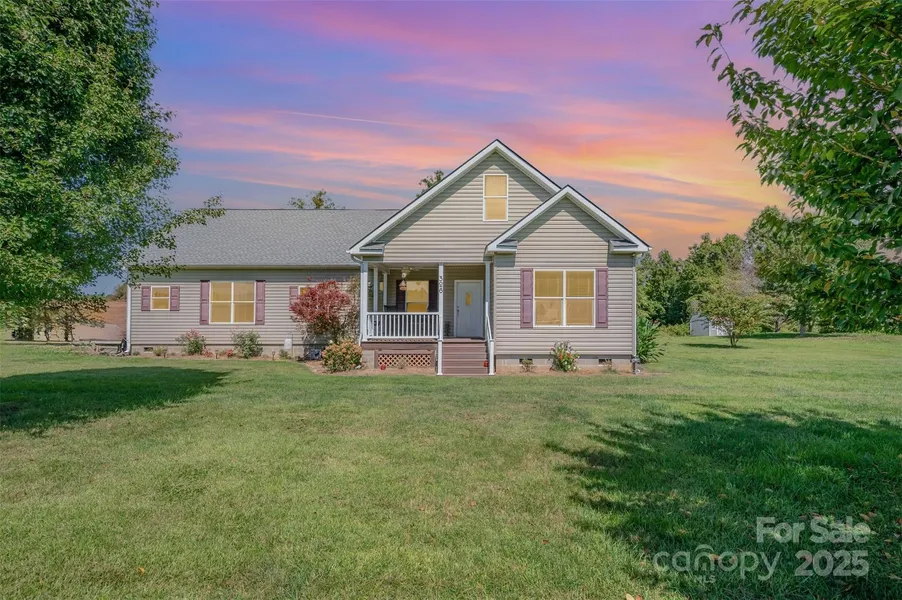 Great home with 3 bedrooms, 2 full bathrooms, 1 half bathroom, offering over 2000 sq ft of beautifully maintained open floor plan living space. Home has architectural finishes with arched doorways, high ceilings, crown molding, and other features that add to the charm and styling of this home. Primary is ensuite with 2 sinks, shower and tub. Home is nestled on a 5.8 acres of land with main road frontage, this home features rural living in Iredell County yet not too far from the beaten path. Walk up attic that is roughed in ready to be finished (1092 sqft) Roof Age - 2023, HVAC Age - 2024. A must-see property that blends comfort, style, and rural living! Acreage is mix of cleared and full mature trees and natural growth.