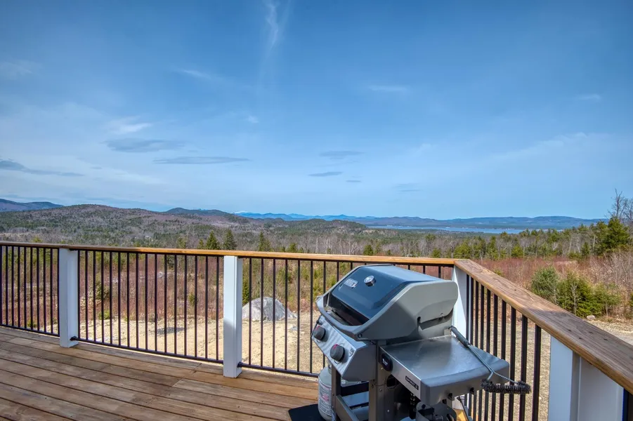 Welcome to 93 Blake Hill Rd, this 2022 built Contemporary home sits on 12.55+/- acre property and offers panoramic views of the White Mountains and Ossipee Lake. This house has underground power from the Town Road to the top, with additional power boxes along the driveway. At the top you will see a beautifully built home with vinyl siding and a large parking area for your family and friends. As you enter into the open concept Kitchen, Dining and Living room with hardwood flooring. The kitchen has stainless steel appliances with an extra beverage refrigerator, granite counter tops and soft close cabinets. On the first floor you also have a bedroom, full bath with laundry room attached. Separate half bathroom with a storage room. Upstairs there's a second bedroom with full bathroom as well as a loft area. In the basement you have full glass facing the mountains and lake view, with Epoxy fl...