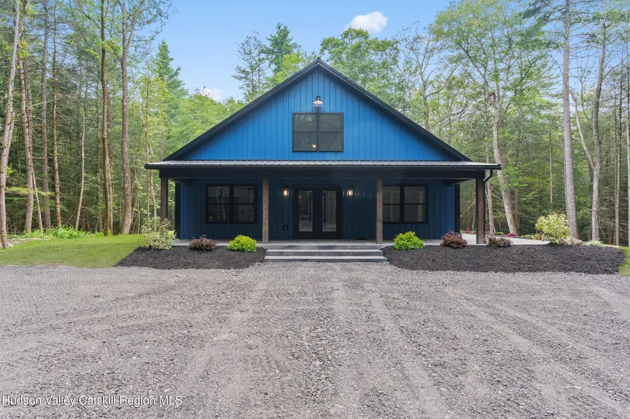 Another spectacular home just hit the market in the heart of the Catskills; The Black Diamond. Identified as Walnut Woods, this 2,160 square foot new construction home, boasts 3-bedrooms and 2-bathrooms. Its open concept, single level living space is exactly what you have been waiting for. Crafted and curated by Hamlet Builders, this model is nothing but a complete display of excellence. Arriving on site, you will recognize the great outdoor living space enjoying the covered porch and tremendous stamped concrete patio wrapping around the home. Greeted by 18-foot cathedral ceilings and paired with a pergola style entryway, the eye instantly catches the bold accents displayed in the entire home. Entering the home you will find 2 bedrooms fit for guests, office space or even full-time living usage. Moving forward into the main living area, find wood-stained ceilings, upscale Modern Forms lighting and a ventless propane fireplace is certainly the gathering space for all. Accompanied by black radiant heated, concrete finished floors, black doors and trim and a kitchen suited for a chef, this home really checks all the marks. Enjoy cooking with top-of-the-line Z-LINE appliances, plenty of counter space and even a fully lit breakfast bar, while enjoying the open concept of this home. Bringing the outdoors in, enjoy secluded nature views of the 2-acre parcel though the double sliding glass doors. The primary suite is more like a retreat with a tastefully designed diamond shaped accent wall, double closets and a step-down, marble-tiled rain shower with 7-additional heads. Moving outside to the wrap-around stamped concrete patio, you will find plenty of room to have an outdoor kitchen and entertaining space perfect for many summer memories to come. 805 Co Route 2 is backed by over 100 acres of privately owned land making the back yard a place where you can truly be in nature. Conveniently located, this home is just a short drive to local hiking hotspots, breweries and everything the Hudson Valley has to offer right at your finger-tips.