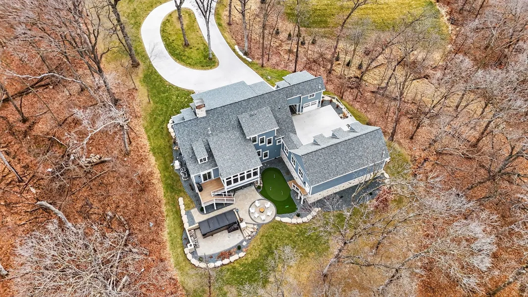 Tucked in the trees at the end of a long, private drive sits a truly distinctive home-thoughtfully designed, positioned, & built on 4.15 wooded acres with timbered land beyond. A classic porte cochere-an arched pass-through connecting the home to a heated/cooled single-car garage/shop, leads to a private courtyard, discreetly concealing the oversized, heated 3-car attached garage. Inside, nearly 6,000 finished sq ft unfolds to 12' great room ceilings, marble tile, European oak hardwood flooring, glass doorknobs & exquisite trim details throughout. The open-concept kitchen, living & dining spaces flow effortlessly with the main-level owner's suite tucked away, offering backyard access, his/her walk-in closets, soaker tub, tile shower & split vanities. The kitchen is designed to impress & perform w/ a 48" range, custom hood, paneled appliances & walk-through pantry w/ chef's doors, beverag...