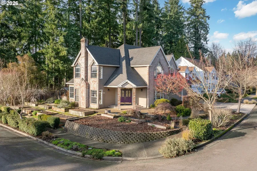 Start your next chapter in this timeless South Beaverton home situated on a generous corner lot backing to Steeplechase Park, where mature trees provide privacy and tranquility. Thoughtfully cared for, the residence offers space, calm, and a strong connection to its natural surroundings. The welcoming entry leads into light-filled living where hardwood floors, tall ceilings, and generous proportions create an airy ambiance and effortless flow. The layout is intuitive yet flexible, ready to adapt to everyday needs. At the heart of the home, the kitchen and family room come together as one expansive gathering space. A large cook's island and breakfast nook anchor the space, while the two-story family room brings volume, natural light, and a gas stove for warmth. From the dining room, step down into a sunken living room centered around a wood-burning fireplace - an inviting place to unwind. A dedicated office with built-ins and a wet bar adds flexibility for work-from-home or creative use. Upstairs, four comfortable bedrooms are positioned for quiet separation from the main living areas. The serene primary suite offers vaulted ceilings, abundant light, a walk-in closet, soaking tub, and heated bathroom floor. The spacious deck sets the stage for indoor-outdoor living, complemented by a greenhouse and shed for added function. Tiered, raised garden beds await your green thumb. An attached three-car garage provides ample room for vehicles, storage, and hobbies. Well-maintained systems and a smart thermostat add modern comfort and efficiency. Close to parks, trails, and everyday conveniences, this home artfully balances privacy, design, and enduring livability.