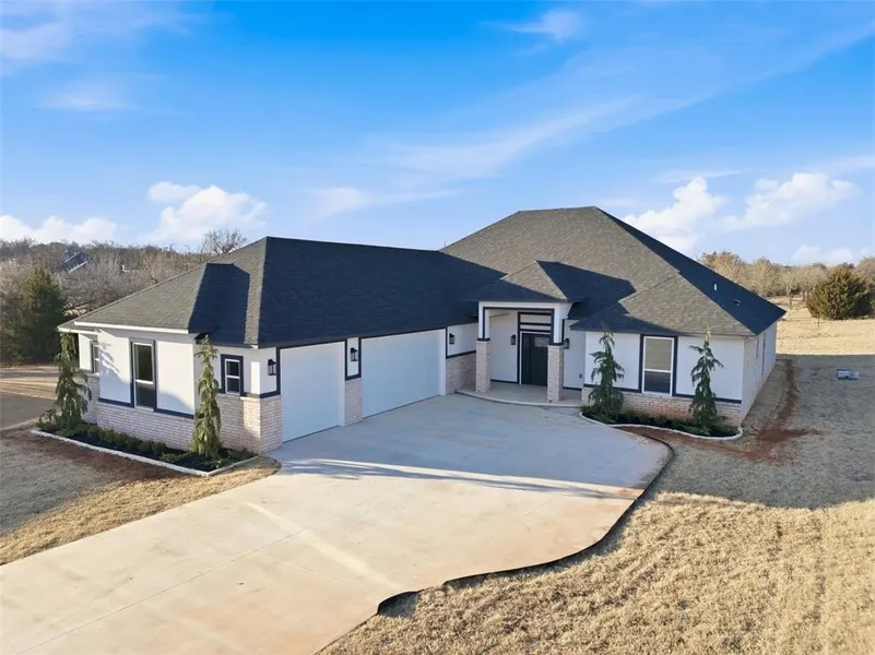 Welcome home to 2432 Raven Circle, a beautiful new construction home in the peaceful community of Blanchard. Resting on nearly an acre, this 2,349 sq ft residence offers the perfect combination of timeless style, thoughtful design, and modern efficiency. The inviting open floor plan connects the living, dining, and kitchen areas, creating a warm and welcoming space for gatherings. The kitchen features a farmhouse sink, granite countertops, stainless steel appliances, and ample cabinetry-ideal for both everyday meals and special occasions. A handsome stone fireplace serves as the focal point of the living room, offering comfort on cool evenings. Four spacious bedrooms provide plush carpeting and generous closet space, while two well-appointed bathrooms include quartz countertops and quality fixtures. Built with efficiency in mind, this home includes EIFS siding and spray foam insulation for year-round comfort and energy savings. A three-car garage provides room for vehicles, storage, or hobbies, and with shops allowed the possibilities for this property are endless. Surrounded by the charm of the countryside, yet with the convenience of nearby amenities, located 30 minutes outside of Norman and Oklahoma City, yet just 45 minutes from TAFB. This home offers a place to truly settle in and enjoy for a lifetime of memories!