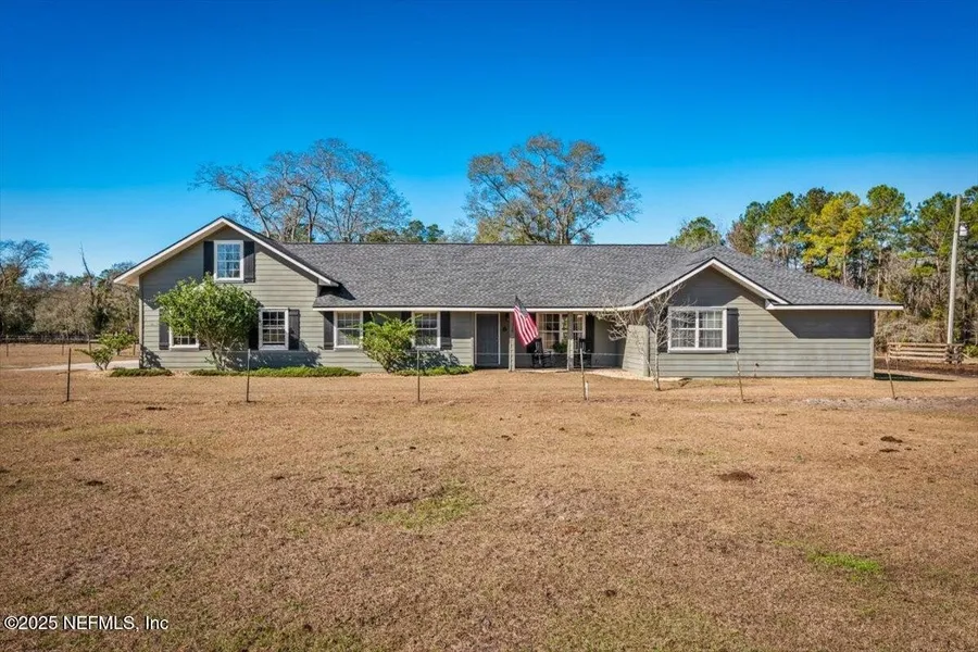 Secluded, country living, still only minutes from HWY 301 in Bryceville. This 3-bedroom, 2.5-bathroom farm style pool home is perfectly situated on 10 acres mostly cleared with divided pastures and opportunities to expand. Step from the welcome mat into an interior embrace that includes antique pine hardwood flooring and an open layout including spacious kitchen, living room, and office. Premium stainless steel appliances and granite counters with tile backsplash make for an inspiring kitchen environment. The kitchen opens seamlessly onto the living room. Primary suite comes with a walk-in closet and large walk in shower. The other two bedrooms, conveniently accessible are ready for styling. Approximate 500-600sqft unfinished suite located above the garage. Attached 3 car garage. The exterior includes tranquil inground pool and a breezy back porch. Also included is the oversized barn with workshop. Enjoy the spectacular views. It's going to feel great to call this place home.