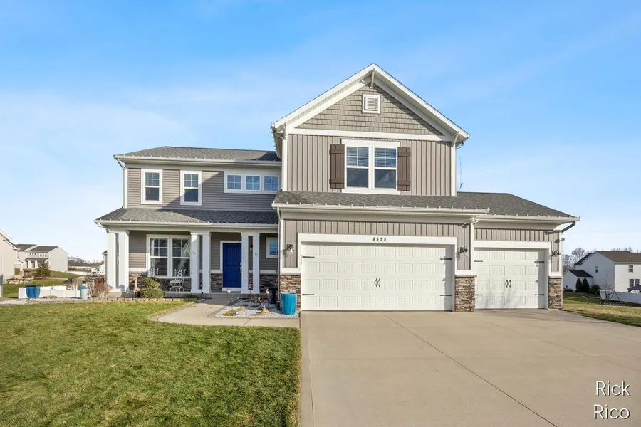 Welcome to this amazing two-story home offering 5 bedrooms and 3.5 baths with a functional and flexible layout, highlighted by the primary suite. The main level features laundry and a versatile den ideal for a home office or flex space. The kitchen includes Corian countertops, soft-close cabinetry, and flows into the living areas with built-in surround sound. The finished walkout basement adds valuable living space with a family room, additional bedroom, and full bath, plus plumbing in place for a future wet bar. Outdoor living is a standout, featuring a low maintenance heated saltwater pool, two-tone composite deck, fire pit area, swings, phenomenal landscaping and an attached slide-creating a space designed for relaxation and enjoyment. Additional highlights include a whole-home generator and 50-amp RV hookup. Located in the Caledonia School District with no HOA, this property offers c...
