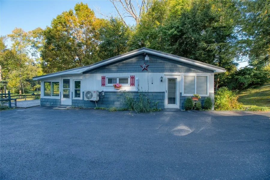 Nestled on a serene and scenic .88-acre lot, this charming 2-bedroom, 1-bath home offers a perfect blend of comfort and nature. Enjoy the convenience of a first-floor laundry and a spacious living room featuring a cozy gas fireplace-ideal for relaxing evenings. The eat-in galley-style kitchen boasts classic white cabinets and ample natural light, making mealtime a pleasure. A large sunroom provides a peaceful space to unwind, while the expansive entertaining deck overlooks a beautifully treed and wooded landscape teeming with wildlife. Whether you're sipping coffee in the morning or hosting gatherings, the deck offers a picturesque backdrop. A gently flowing creek runs behind the property, adding to its tranquil ambiance. Car enthusiasts and hobbyists will appreciate the 4-car detached garage, providing generous storage and workspace. This home is a rare opportunity to enjoy privacy, nat...