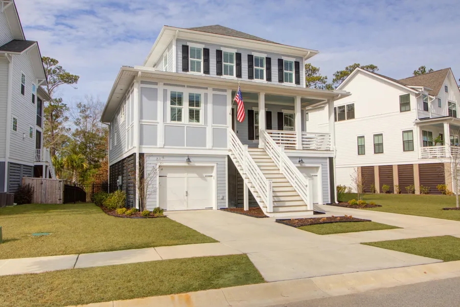 Dream elevated home in Waterfront living awaits you at Wando Village! Welcome to your piece of paradise in this stunning waterfront community with private community dock. This home offers tranquil views, comfort, and privacy. You will be greeted by an open concept layout with natural light. The spacious living area seamlessly blends with a modern kitchen complete with elegant countertops, plenty of storage, and modern appliances. Perfect for entertaining friends and family or enjoying a quiet evening at home. Retreat to the master suite with large windows and spa like ensuite bathroom features dual vanities, a soaking tub, and spacious walk in shower. The private back deck overlooks a wooded area with beautiful paver patio and firepit. There are two loft areas that could be used as a flex room for students or TV room with one large enough for an additional bedroom. Situated in a vibrant community with private community boat dock and common area with playground. All with a friendly neighborhood atmosphere, join in with book club, community gatherings, and bunco nights! Do not miss your chance to be a part of coastal living at its finest!
