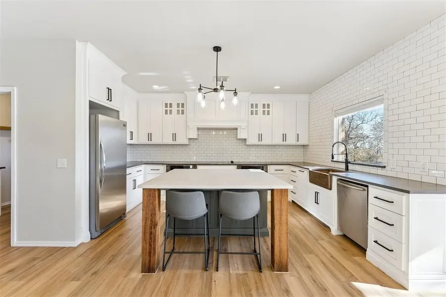 Escape from city life and settle into 5.05 peaceful acres minutes from I40 and the Kickapoo Turnpike! Just beyond the gate of this private secluded property is an abundance of trees and a long concrete drive that leads you directly to the expansive 60x40x12 shop with 2 tall roll up doors and a separate 20x25 private office. Continue to the home & be truly impressed by the striking red brick, soft neutral siding and black double doors that lead you into the home. Enter to a foyer and instantly be welcomed by NEW hardwood floors throughout the main level and NEW paint everywhere with a staircase that wraps around the wall to the 2nd floor. Adjacent to the foyer is a study/office with double barn doors creating a private work space. The spacious great room has a vaulted ceiling and brick hearth that stretches from floor to ceiling making it the focal point in the room. Large windows on each side allow light to pour in. The open-concept kitchen is both functional and beautiful, with crisp white shaker cabinetry, gray quartz countertops, and a generous island perfect for gatherings. High-end stainless steel appliances include double ovens, a built-in cooktop, microwave, dishwasher, and an ice maker. Tucked under the staircase is a spacious walk-in pantry, providing ample storage. The expansive primary suite is a true sanctuary, boasting a vaulted ceiling, double barn doors, and a spa-inspired ensuite. Unwind in the soaking tub or enjoy the glass-enclosed shower, dual vanities, and a custom walk-in closet with extensive built-ins. Downstairs is a utility room and a 1/2 bath for guests. Upstairs are 4 additional oversized bedrooms with walk-in closets and 2 additional bathrooms featuring double sinks, showers with decorative tiles and plenty of cabinets. Step outside to your personal paradise-an entertainer's dream with an expansive patio, covered dining area, sparkling pool, and a putting green for added fun. This park-like setting is the ultimate in luxury and leisure.