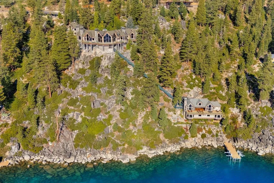 Perched above the deep blue waters of Lake Tahoe, Crystal Pointe presents a rare sanctuary where nature, architecture, and artistry unite. Pass through the private gates and immediately, the grandeur reveals itself. Pathways meander through sculpted gardens, waterfalls, and a level lawn. This 5.14 acre compound includes a separate lakeside home with an open great room, full kitchen, and expansive indoor/outdoor living. Step inside the main residence, where soaring windows frame the lake and each room is thoughtfully designed with custom details. From silk wallpaper in the state of the art theater to the perfectly positioned fossil stone floors, this home features rare architectural elements. Within the main house there is a guest wing with four ensuite bedrooms, a kitchen, living space and laundry. There is also a caretaker residence below the garage. The two glass funiculars and elevators provide direct access to the 525 feet of lake frontage and deep water pier with two boat lifts.