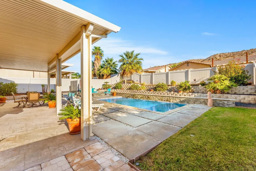 Welcome to desert living at its best in the gated Mountain View Community. Featuring a private pool and a host of recent upgrades, this move-in-ready 2-bedroom, 2-bath home offers comfort, flexibility, and exceptional value-whether you're searching for your first home, a vacation retreat, a peaceful retirement residence, or a rental investment. With just over 1,200 sq. ft., the home boasts a newer high-efficiency A/C unit and updated kitchen countertops on both the island and main counters. The bright, open-concept layout welcomes abundant natural light. The spacious primary suite offers direct access to the backyard, allowing you to step outside to the pool and patio with ease-perfect for enjoying quiet mornings or evening breezes. Step outside to a backyard designed for year-round enjoyment. The private pool, covered patio, and firepit create the perfect setting for relaxing, entertain...