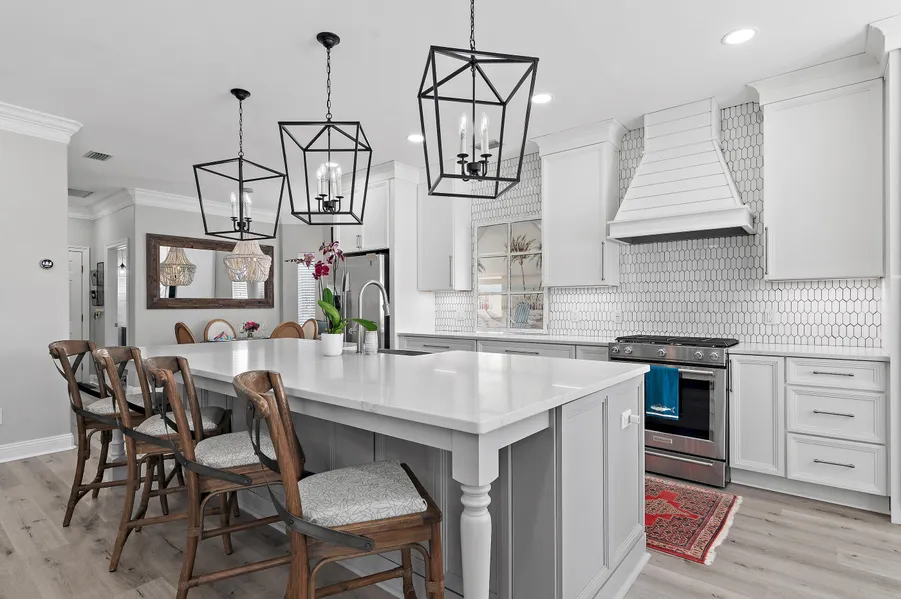 Welcome to 4600 Sailmaker Lane, a beautifully renovated lakefront retreat nestled within the prestigious gated golf community of Regatta Bay in Destin, Florida. This elegant updated 3-bedroom, 2.5-bath home with a 2-car garage offers the perfect blend of comfort, style and modern upgrades - all set against the serene backdrop of a private lake. Step inside to discover a thoughtfully remodeled interior featuring high-end finishes and custom touches throughout. Click ''more'' to continue. The upgraded master suite is a true sanctuary, boasting a spa-inspired bathroom with a freestanding tub, quartz countertops, custom cabinetry and a sleek Schluter system shower. Solid core doors, Toto toilet and high-end luxury vinyl plank flooring complete the space with sophistication. The master bedroom includes custom window treatments and a custom walk-in closet with wood shelving. The living room impresses with custom wood shelving, LED recessed lighting, shiplap fireplace wall and upgraded sliding glass doors for seamless indoor-outdoor living. The chef's kitchen is equipped with new top-of-the-line KitchenAid appliances, a new refrigerator compressor and ambient lighting upgrades. The powder room and laundry room have also been fully updated with stylish fixtures and quartz counter tops. Enjoy Florida's outdoor lifestyle from the newly enhanced lanai, featuring a durable Polyurea floor coating, new screen framing and a relocated door for optimal lake views. The garage has been upgraded with a matching Polyurea floor, refurbished doors and new exterior lighting. Outside, the home shines with a full exterior repaint using Sherwin-Williams Elastomeric Paint, new gutters, stucco repairs and a professionally designed landscape plan. A brand-new seawall adds 12 feet of usable yard space, complemented by extensive paver installations that flow from the backyard to the front. This turnkey home is a rare find in Regatta Bay offering luxury, privacy and a lifestyle of leisure just minutes from the beach, shopping and dining.