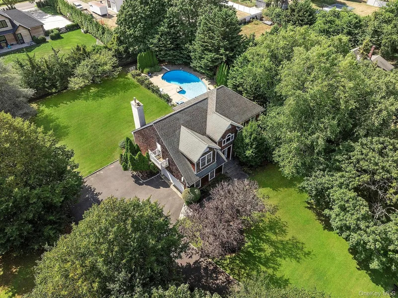 Located in a quiet and private setting, this well-maintained home sits on 0.87 acres and offers 4 bedrooms, 2.5 bathrooms, and approximately 2,400 square feet of interior space plus a finished lower level. The first floor features an open kitchen with stainless steel appliances and a breakfast area with sliding doors leading to the back deck. Additional first-level spaces include a formal dining room, living room with fireplace and wet bar, and a powder room. Upstairs, the primary suite includes a walk-in closet, en suite bathroom, and private balcony. Three additional bedrooms, a full hall bathroom, and a large landing with room for sitting, complete the second level. The backyard includes an in-ground pool, expansive lawn, and plenty of room for outdoor living and entertaining. Located in the East Moriches School District with choice of three high schools: Westhampton Beach, Center Mor...