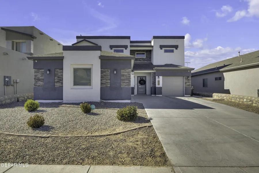 A 5-bedroom, 3-bathroom sanctuary for modern living, this El Paso home greets you with an airy floor plan and thoughtful details. The living room flows seamlessly into a dining area and kitchen, where stainless steel appliances and crisp white countertops create a fresh, functional vibe. There's a cozy reading nook upstairs. The backyard is easy to maintain, fully landscaped with artificial turf, equipped with a powered pergola wired for a TV, solar panels, and raised rock walls for extra privacy.