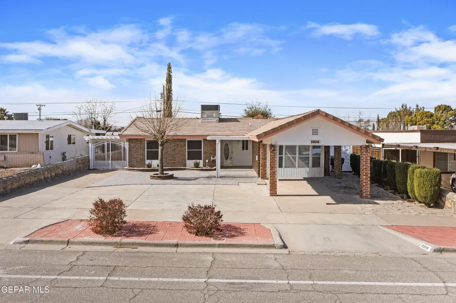 Step into comfort and convenience at 2205 Villa Plata Drive. This charming brick home offers 1,599 sq ft of well designed living space featuring 3 bedrooms and 2 baths. A gated parking spot plus an additional one car covered space provide security and ease, while the low maintenance front yard keeps upkeep simple. Inside, you'll find a bright white kitchen with an inviting eat in area perfect for casual meals. The home offers two spacious living areas, including a great room with tile flooring and a cozy gas fireplace, as well as a second living space with warm wood flooring. A dedicated utility room adds everyday practicality. Enjoy year round relaxation in the expansive sunroom, or step outside to the beautifully designed backyard featuring custom covered pergola areas, a covered patio, and a large storage shed. This home blends functionality, charm, and flexible living spaces in a desirable El Paso location.