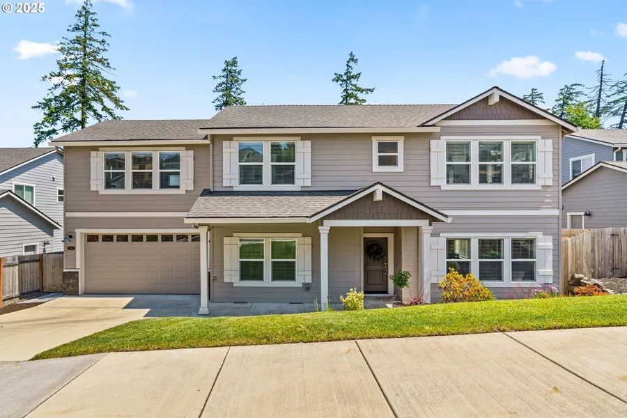 Located in South Eugene's prestigious Moon Mountain subdivision, this beautifully built 2023 home by award-winning MonteVista Homes showcases the popular Douglas Floorplan, offering 4 bedrooms, 3 full baths, and 2,479 sq ft of thoughtfully designed living space. The open-concept kitchen is a chef's dream, featuring quartz countertops, stainless steel appliances, a farmhouse sink, large island with 5-burner gas range, and a custom designer range hood. The kitchen flows effortlessly into a spacious living area complete with a gas fireplace and expansive views-ideal for both entertaining and everyday relaxation. Upstairs, you'll find a versatile bonus room, two well-sized bedrooms, and a stunning primary suite with a spa-like bath that includes a soaking tub, tiled shower, and dual vanities. On the main level, a private guest suite with full bath provides the perfect space for visitors or a home office. Enjoy outdoor living year-round on the covered patio overlooking a professionally landscaped yard with a sprinkler system-and take in breathtaking views of the city and surrounding mountains. All of this just minutes from the University of Oregon, I-5 access, and the vibrant amenities of downtown Eugene.