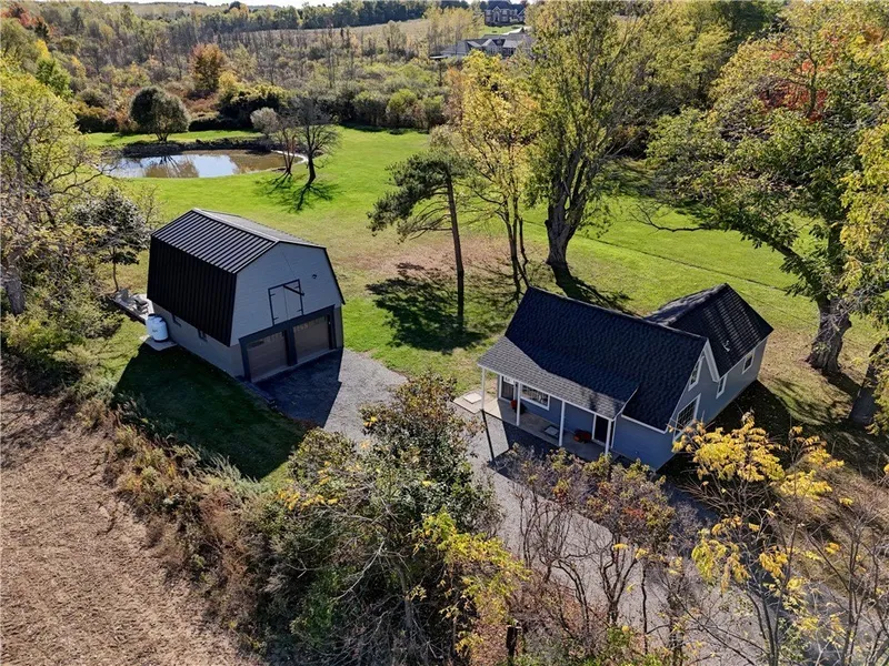 Unicorns do exist-and this stunning, one-of-a-kind property in Penfield proves it. Tucked away on just under 3 serene acres, this beautifully renovated 2-bedroom Cape Cod offers the perfect combination of modern updates and timeless charm, all just minutes from local amenities. Blending classic style w modern comforts, every inch has been thoughtfully upgraded. Enter to find new hardwood floors, recessed lighting, and gorgeous custom windows allowing an abundance of natural light and postcard-like views in every direction. Enter the completely renovated kitchen to find new cabinets, custom countertops, a spacious island, and stainless-steel appliances. The first floor boasts a generously sized primary bedroom w two ample sized closets and a convenient laundry area, making everyday living effortless. Rounding off the main level is the tastefully reimagined bathroom that combines classic character w sleek, smart design. Upstairs, the versatile second level offers endless possibilities - perfect as a teen suite, home office, guest space, or creative studio. Every detail has been thoughtfully curated to create a functional and inviting space. A tear-off architectural roof, new heating and cooling systems, updated electric, and countless additional improvements, means no detail was overlooked. Step outside and fall in love w the peaceful, park-like setting: a private pond, pear tree at the pond's edge, and apple trees at the hedge line - this stunning piece of land is ideal for gardening, gatherings, or simply soaking in the quiet beauty of nature. A stamped concrete patio offers the perfect place to relax, entertain, or take in the picturesque views. This property also features a rare two-story, two-car garage/barn w all new metal roof, garage doors, concrete floor with epoxy coating, lift, and staircase to the second level-perfect for a workshop, studio, storage, or future living space. Rural beauty and modern ease are waiting for you - but not for long! Schedule your tour today! Delayed negotiations set for 10/21/25 at 1pm.