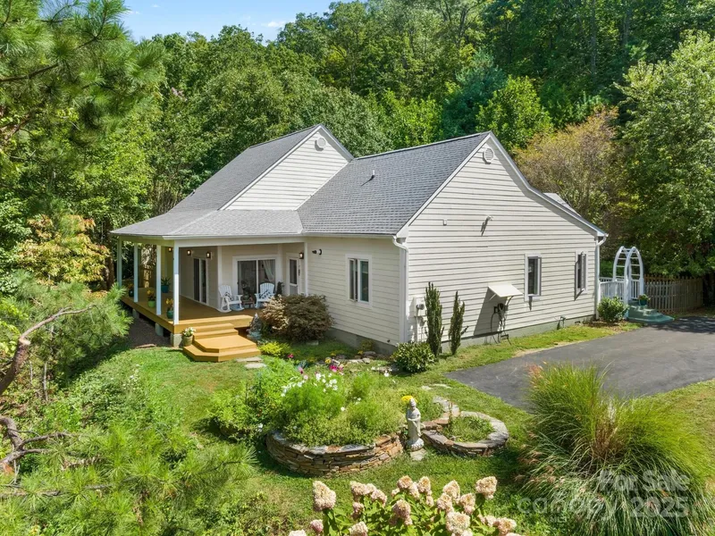 Elegant single-story 3BR home on over 9 acres in Fairview, just 15 minutes from Asheville! This rare mountain retreat offers privacy and versatility, with 3 separate lots providing peace of mind and potential building sites or multi-generational living options-all nestled in the beauty of WNC's temperate rainforests. The open, split floor plan is flooded with natural light from vaulted ceilings and skylights, featuring refinished hardwood floors, crown molding, and a spacious sunroom with exercise area. Cozy up with a wood stove or gas log fireplace in the primary suite. Thoughtful upgrades include cedar-lined walk-in closets, a volcanic stone claw soaking tub, alarm system, whole-house generator, mounted EV charger, safe in closet, and paved driveway. Enjoy the outdoors with professionally designed landscaping, stacked flagstone beds, stone water fountain, covered front porch with vault...