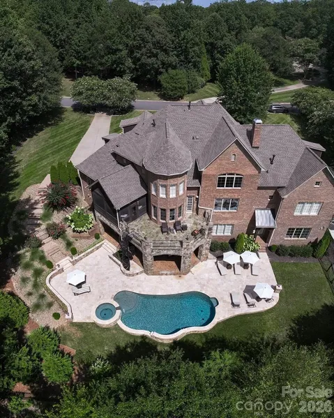 Exceptional brick home on 13th tee box of Country Club of the Carolinas w/ a private backyard oasis. Heated pool, spa & travertine pavers create resort-style retreat. Main level features:10' ceilings, oak floors, office w/ vaulted ceilings, wet bar & built-ins. Spacious primary suite on main w/ vaulted ceilings, 2 walk-in custom closets & dual vanities. Main-level guest suite w/ full bath. 2 story great room opens to chef's kitchen w/ oversized granite island. Upstairs offers 3 bedrooms, 3 full baths & private living room suite. Expansive basement includes a bar w/ dishwasher, family room w/ fireplace, full bath & over 1600 sq ft of unfinished space-already stubbed for plumbing & has HVAC-perfect for a gym, guest suite, or flex rooms. 2022 roof, whole-home water filtration, irrigation, landscape lighting, screened porch w/ fireplace, covered patio w/ fireplace & 4-car garage. Golf course views in a premier country club setting complete this entertainer's dream right on the state line.