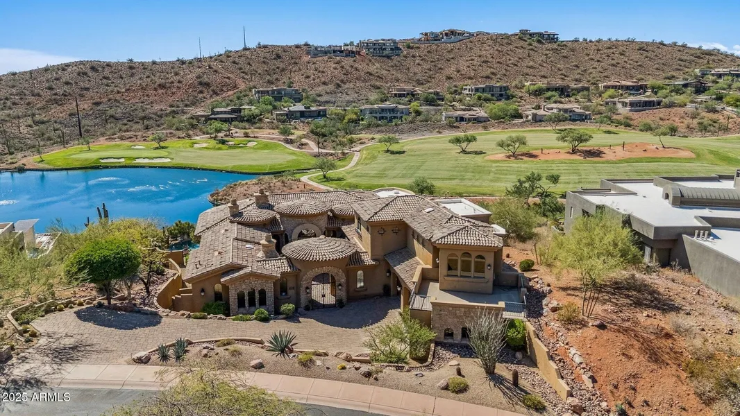 PRICE REDUCTION! This is one of the premier lots in the entire community! Behind the gates of Firerock Country Club main access gate you will find a one of a kind oasis that is a mix between old world charm & your own resort. This home has outstanding views of the golf course, the interior lakes, mountain view's, spectacular sunsets along with city light views! This home truly has it all! Open expansive floor plan with large skylights, bringing in natural light throughout. The overall floor plan is 90% on lower level, the remaining 10% has 2 Bedrooms with on suites on the upper level. A large covered patio area that wraps around the entire back part of the home that will allow you to enjoy the Arizona lifestyle. There is high-quality finishes throughout home with a true resort like feel!