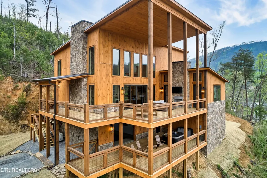 Welcome to ''Glory'', where luxury meets the mountains! This stunning, custom built 5-bedroom, 3.5-bath pool cabin with sprinkler system and occupancy for 16 is located within walking distance to downtown Gatlinburg and offers top notch amenities, upscale finishes, and an unbeatable location - all while being tucked away down a quiet street with mountain views and no mountain roads! Not many unicorns like this cabin!! Enjoy incredible mountain views from multiple floors, a private heated indoor pool, theater room, 2 game rooms, tile showers and multiple fireplaces with natural Tennessee stacked stone throughout. Game room amenities include shuffleboard, foosball, basketball, multicade, and a card table-plus a spacious hot tub deck with sweeping Smoky Mountain vistas. The open-concept living area features two-story floor-to-ceiling windows, natural Tennessee stone fireplace, and a fully equipped chef's kitchen with top of the line quartz counters and stainless appliances. Beautifully designed for both personal enjoyment and short-term rental success. Convenient to Gatlinburg, Pigeon Forge, and the Great Smoky Mountains National Park. This is your opportunity to own a high-performing, turn-key luxury investment or personal retreat in the heart of the Smokies!