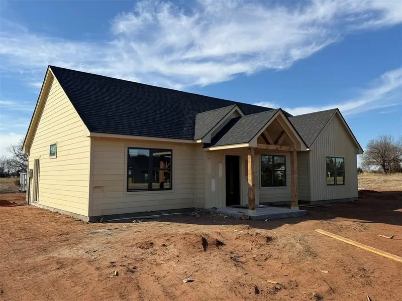 Welcome to country living with modern comfort! This brand-new Wilson Homes build sits on a peaceful 0.76-acre lot surrounded by Oklahoma's open skies and quiet backroads. The thoughtfully designed floor plan offers 1,425 sq ft of living space, featuring 3 bedrooms and 2 bathrooms with a bright, open layout that feels both spacious and cozy. The living area boasts a vaulted ceiling and large windows that flood the space with natural light, while the kitchen impresses with custom cabinetry, stainless steel appliances, and a generous island perfect for family gatherings. The primary suite includes a tray ceiling, walk-in closet, and a beautiful private bath with dual sinks and modern finishes. Enjoy morning coffee or evening sunsets on the covered front and back porches, surrounded by quiet country charm. With a two-car garage, durable board-and-batten exterior, and Wilson Homes' signature ...