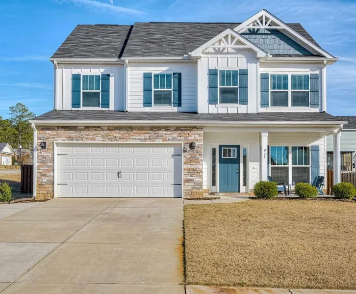 Spacious and thoughtfully designed, this 2023-built 4-bedroom, 2.5-bath home offers 2,148 square feet of flexible living space with modern upgrades throughout. Just off the foyer, a main-level flex room provides the perfect space for a home office, playroom, or formal sitting area. A conveniently tucked-away half bath adds privacy for guests. The large living room flows seamlessly into the dining area and kitchen, creating an open and inviting layout ideal for everyday living and entertaining. The kitchen features granite countertops, a custom backsplash, stainless steel appliances, a corner pantry, and an attached counter-height bar accented with pendant lighting. Luxury vinyl tile flooring extends throughout the entire first floor. Easy access to the laundry room and garage is located just off the kitchen hallway. Upstairs, a loft offers additional living or play space. The generous owner's suite includes a corner sitting area and a spacious ensuite bath with double vanities, granite countertops, a framed mirror, separate garden tub and glass-enclosed shower, and a large walk-in closet. Three additional bedrooms are well-sized and accommodate queen-size beds. The guest bath features double sinks, granite countertops, a tub/shower combination, and transom windows that provide natural light. Enjoy outdoor living with both front and rear covered porches. The expansive rear porch features extended concrete spanning corner to corner of the home and overlooks a fenced backyard. The front exterior includes stone accents along the garage and water table, as well as an additional parking pad attached to the driveway. Situated on a corner lot, this home is located in a neighborhood with no homeowners association, offering comfort, functionality, and freedom.