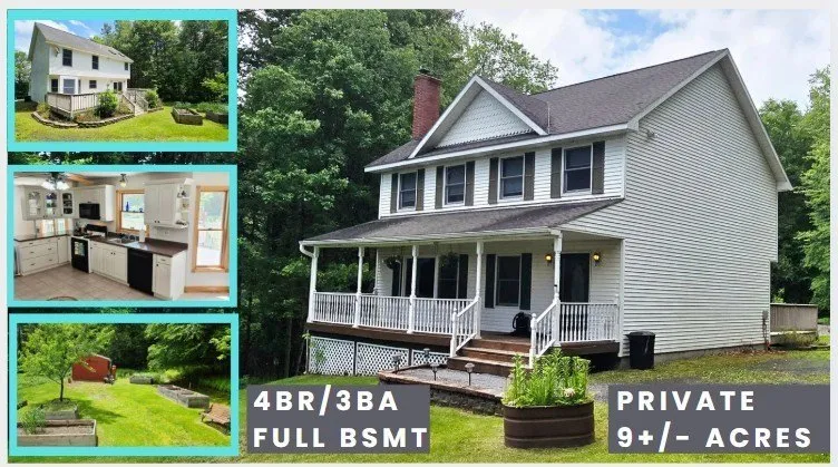 Welcome to your dream country retreat! This contemporary 2-story farmhouse sits on 9 serene acres just 5 miles from the charming village of Stamford and only 20 minutes from Oneonta. Perfectly sited off a quiet, town-maintained road, this move-in ready home offers the ideal blend of privacy and accessibility. Step inside to discover a bright, open floor plan with generous room sizes, hardwood flooring, and custom moldings throughout. The heart of the home is a fully equipped cook's kitchen with a spacious dining area, perfect for entertaining. The cozy living room features a wood stove and connects seamlessly to a formal dining space with glass doors leading to a large deck (built with 2x12 supports to accommodate a hot tub) and a level, private backyard. Upstairs, the primary suite is a true sanctuary with vaulted ceilings, skylights, a large walk-in closet, and an unfinished en-suite b...