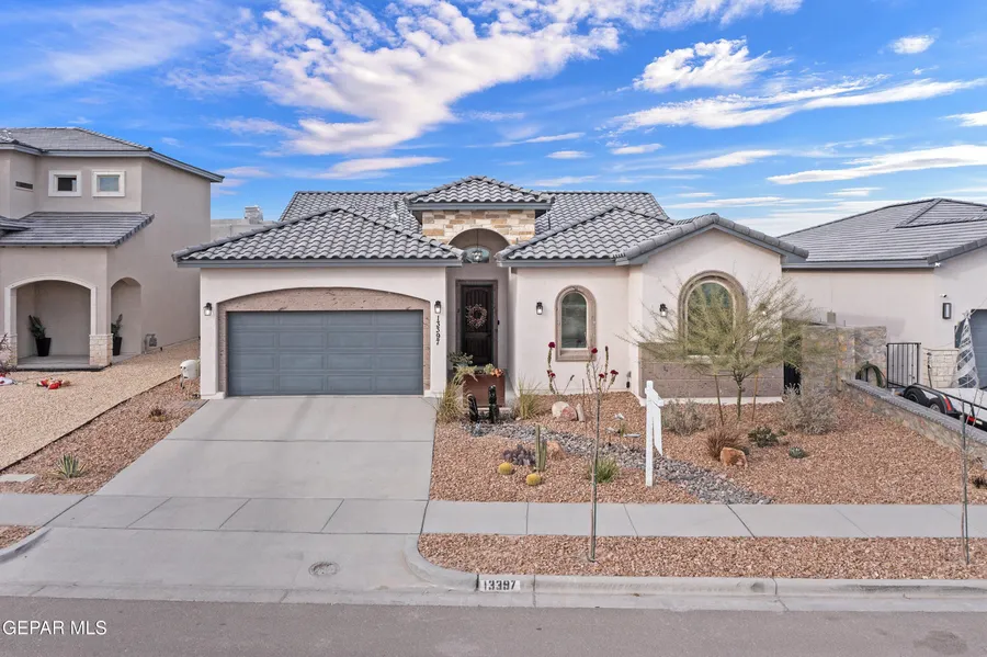 Welcome to 13397 Emerald Glass, a beautifully crafted single level home offering 2,173 sq ft of comfort and style on a .17 acre lot. This 4 bed, 3 bath home features cathedral ceilings, exposed beams, an inviting foyer, breakfast area, ceiling fans, smart home tech, high speed internet and low/no VOC materials for healthier living. The kitchen includes quartz countertops, an oversized island and modern finishes ideal for cooking, gathering and entertaining. Additional details throughout the home highlight quality, care and thoughtful design that enhance everyday living. The primary suite offers a walk in closet and double vanity, additional bedrooms provide flexible space for guests, work or hobbies. Step outside the private retreat: a gunite, inground, saltwater pool with pebble finish and sun deck, plus a robotic cleaner for easy upkeep. Thoughtful upgrades, quality finishes and resort...