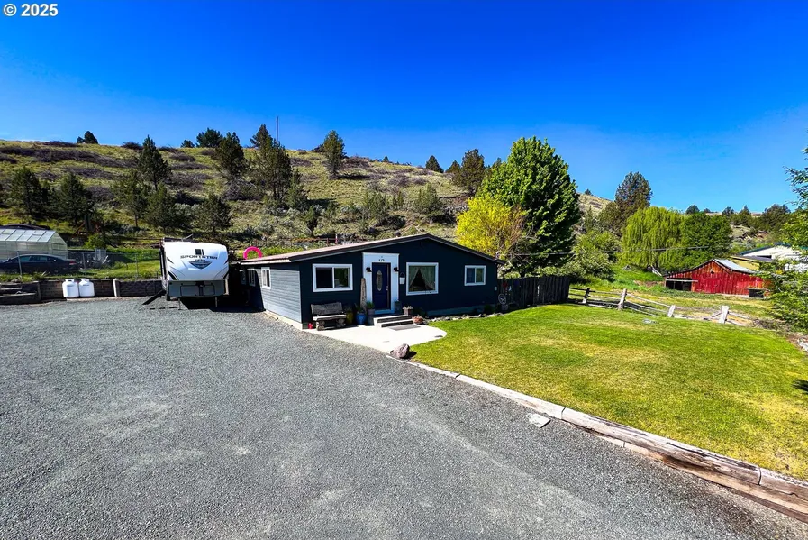 This charming 0.61-acre lot features ample parking and a serene backyard complete with a water feature. The home, with its open concept design, encompasses 1,607 square feet and includes three bedrooms and two bathrooms. The spacious living room is equipped with a woodstove, perfect for staying warm during the winter months. For climate control, the house has two mini splits for efficient heating and cooling. The centrally located kitchen offers excellent sight lines throughout the home. A generous laundry room features built-in shelving, ample space for freezers, and a propane on-demand hot water heater. The property includes a 480-square-foot detached garage with a concrete floor, workbenches, a power supply, and a lean-to for additional covered storage. The gravel driveway provides room for multiple vehicles to park comfortably. The backyard is fully fenced and cross-fenced, offering a patio with a covered awning, creating an ideal dining area for summer gatherings. It includes multiple landings and ditch rights to ensure a lush, green lawn.