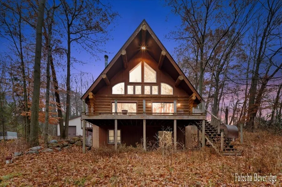 Fall in love with this spectacular Engelmann Spruce Log Home!! Situated on 2.37 secluded acres, it boasts 3 stories of living space and a 40' x 48' pole barn. The entry opens to a living room with fireplace, floor to ceiling windows, and a slider leading onto a large deck with beautiful views. The kitchen is flanked with a large formal dining area on one side and an ample breakfast area on the other. A half bathroom with laundry is adjacent. Up the stairs you will find a loft, primary with ensuite with dual vanities, an expansive bedroom/bonus room, full bath and connected third bedroom. There is an attached garage with stairs leading to a full walkout basement, ready to finish out a family room, bedroom and full bath. The property backs up to several hundred acres of state land to enjoy and explore. Call for a private tour of this stellar home today!